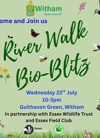 🌍 Witham Town Council are holding their first Bio-Blitz on 23rd July and we are inviting residents, of whatever age, to join us in recording the different types of plants, animals and insects on the River Walk with the help of the expertise from Essex Wildlife Trust and Essex Field Club. 🐞 The goal is for all of us to learn more about local wildlife, help with conservation, and have fun discovering the natural world. Think of it as a wildlife treasure hunt! 🐾 🦋 🌿 🪱